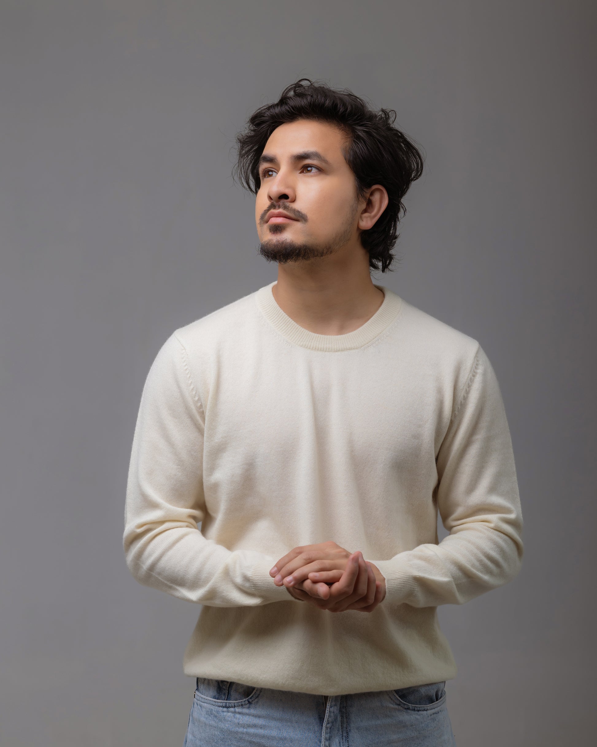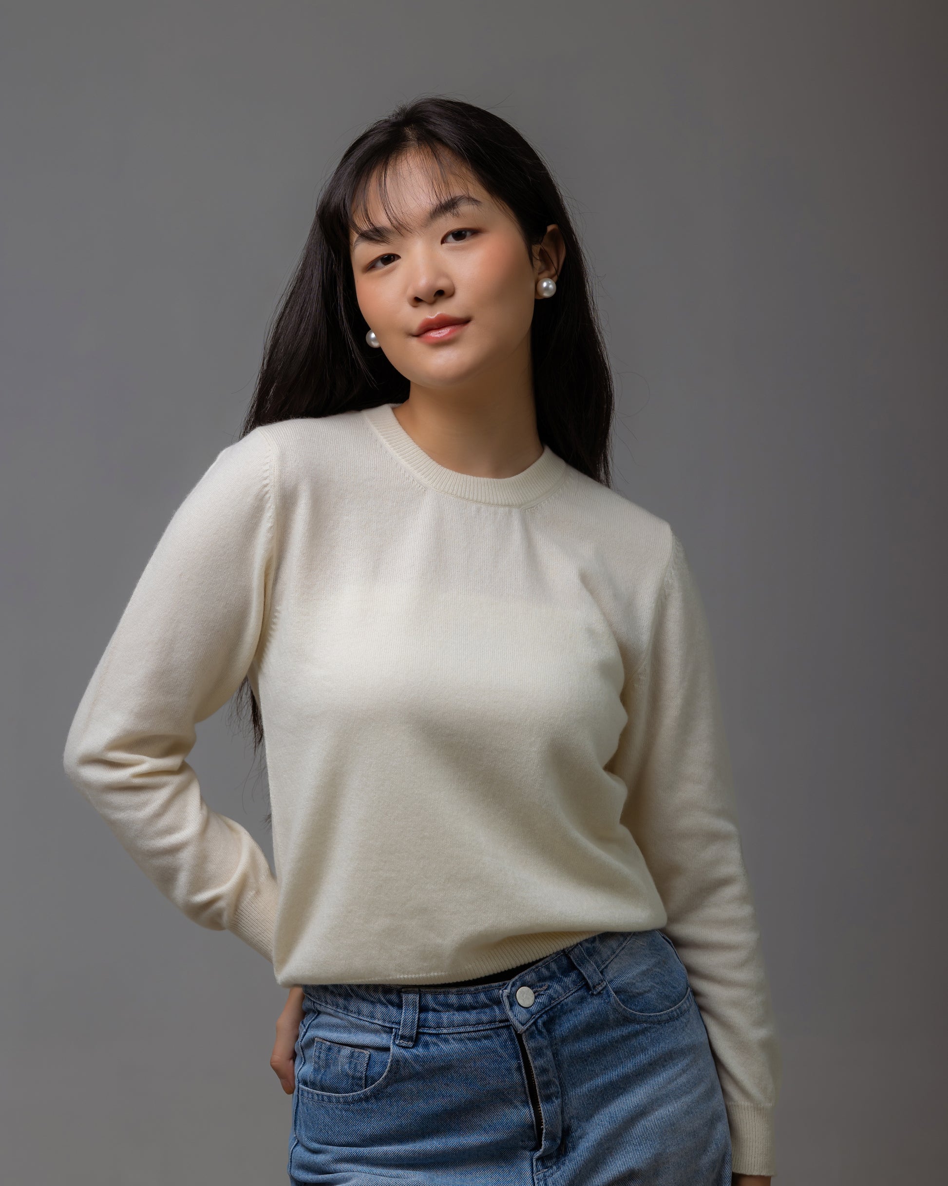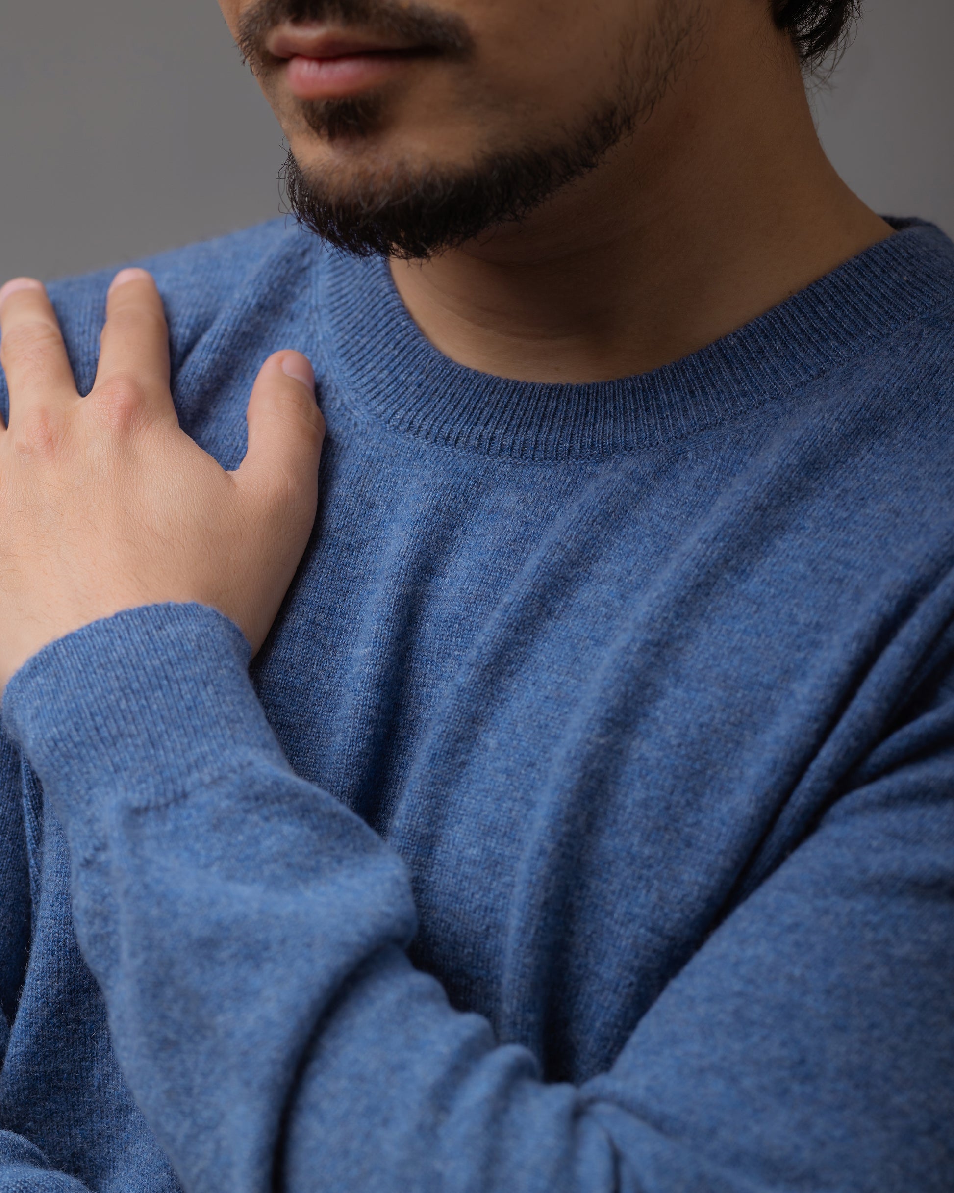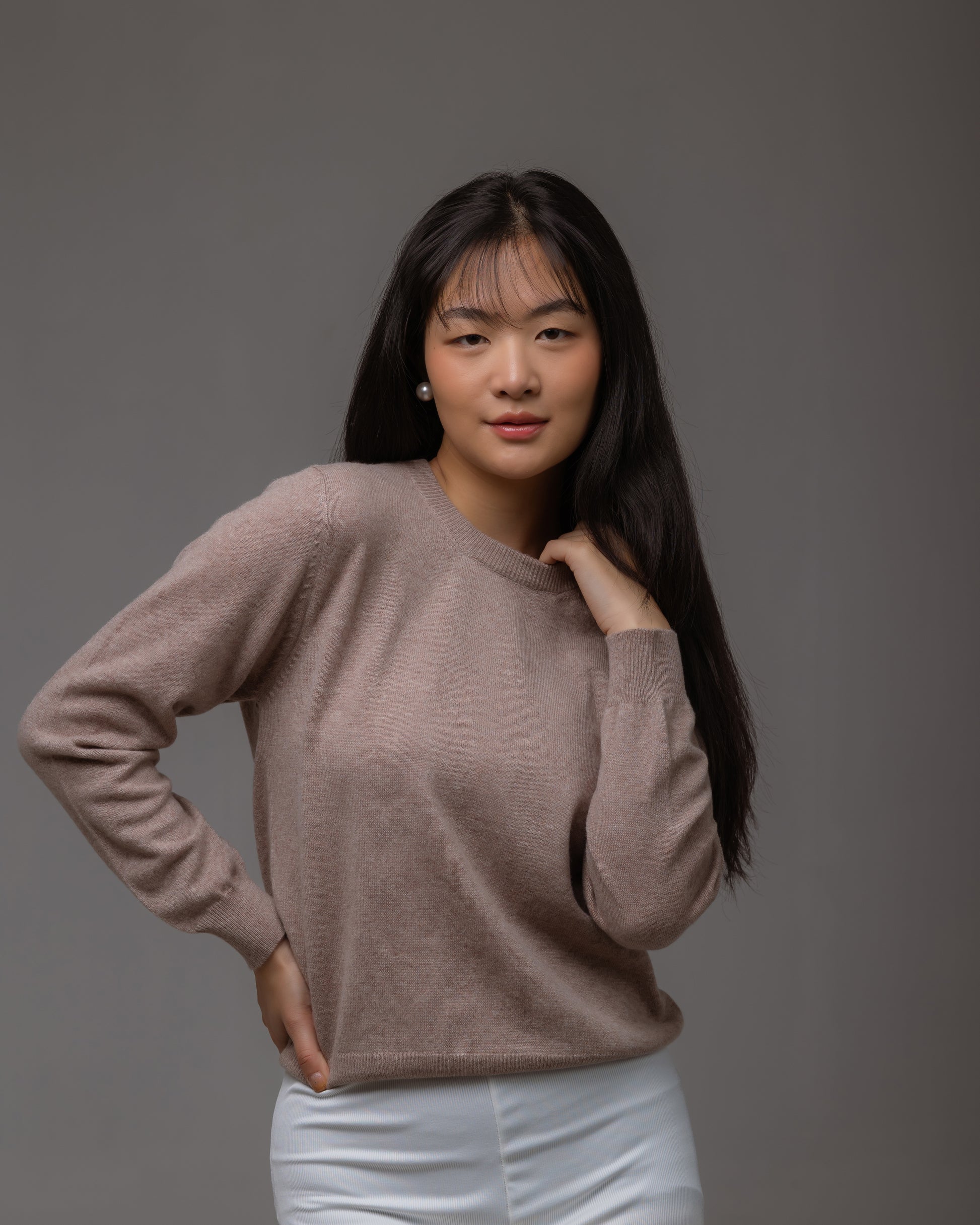上質な**グレードAカシミヤ100%**を贅沢に使用した、ユニセックス仕様のクルーネックセーターです。
